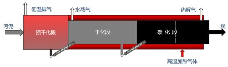 污泥在密闭设备中被间接加热到500 ℃左右,有机物分解成炭 + 热解燃气(H₂、CH₄、CO 等)。由于无空气参与,硫、氯、重金属等不会进入气相,尾气仅为清洁燃料燃烧产物。