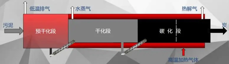 通过干化段充满的水蒸汽对碳化段完成水蒸汽气封,确保绝氧碳化过程。